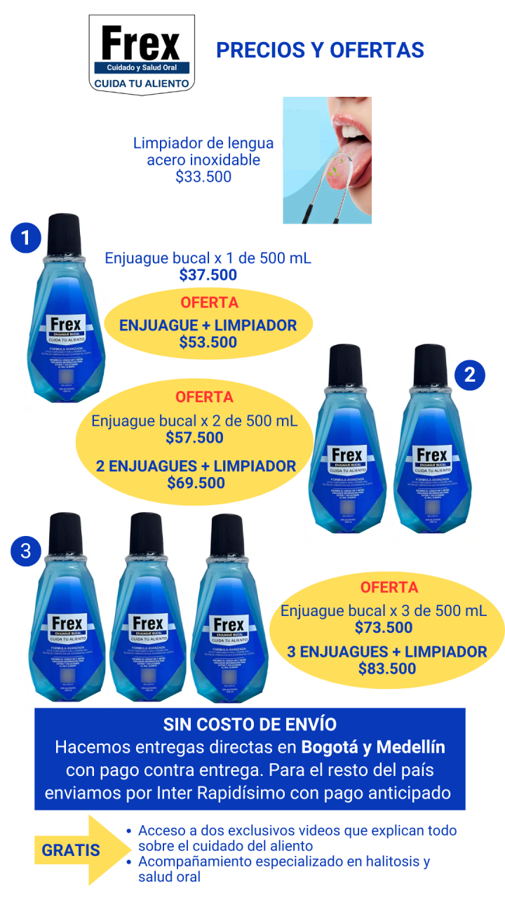 En más de un 90%, el mal aliento tiene origen en la boca y básicamente se relaciona con bacterias. Frex Cuidado y Salud Oral actúa eficazmente neutralizando compuestos malolientes, además, es el único enjuague que enseña todo sobre el mal aliento con exclusivos videos a los que se accede cuando se adquiere el producto, en los que se explica detalladamente los cuidados que son necesarios para disfrutar de aliento saludable.